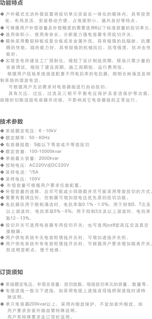 HYTBB系列中高壓無功補償裝置-戶外箱式用于220kV及以下配網(wǎng)變電站的6kV、10kV母線的無功自動補償和變電站的有載調(diào)壓,通過對電站有載調(diào)壓分接頭的自動調(diào)節(jié)和對母線上的電容器組的自動投切,來實現(xiàn)對變電站電壓和無的綜合控制。