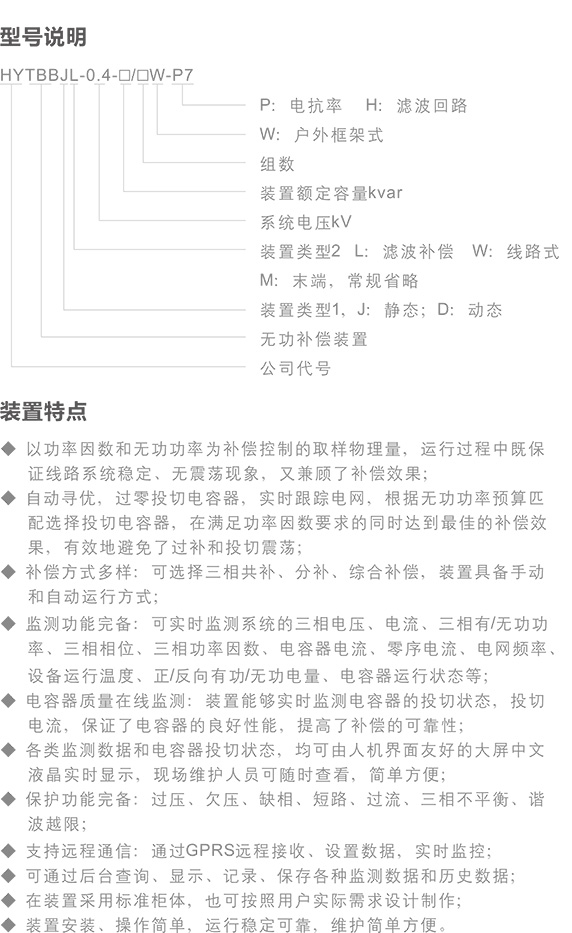 HYTBB低壓無功綜合補(bǔ)償裝置適用于配變、低壓線路,或其他的戶外低壓配電系統(tǒng)場合,實(shí)現(xiàn)無功自動跟蹤補(bǔ)償。裝置集無功補(bǔ)償優(yōu)化和電力監(jiān)測于一體,采用固定補(bǔ)償和動態(tài)補(bǔ)償相結(jié)合方式??蓪?shí)時跟蹤電網(wǎng)的運(yùn)行狀態(tài),具有平滑的補(bǔ)償性能,具有最優(yōu)的補(bǔ)償效果。系統(tǒng)可有效補(bǔ)償線路無功功率,保證功率因數(shù)穩(wěn)定,降低線路損耗,提高變壓器、傳輸線路的利用率,提高負(fù)載端的供電質(zhì)量。