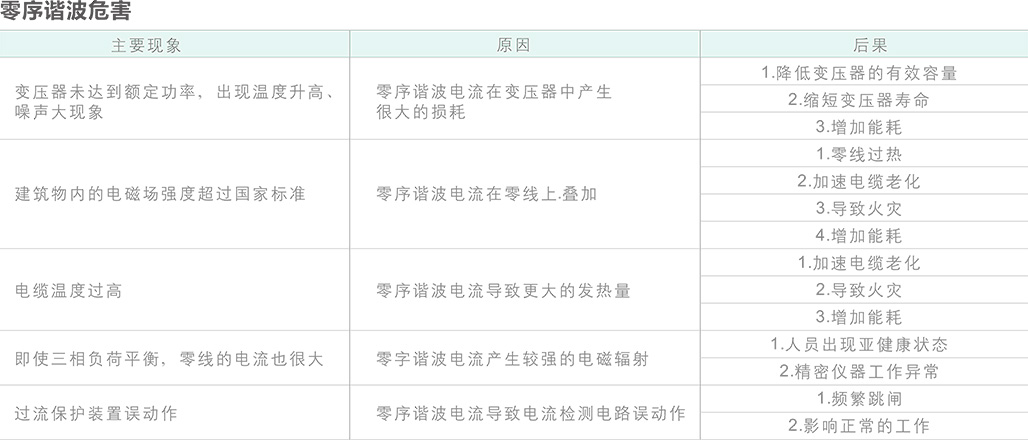 零序諧波存在3、6、9、12次諧波存在于零線中,零線電流過(guò)大容易導(dǎo)致斷路器跳閘、零線發(fā)熱嚴(yán)重引起火災(zāi)安全隱患。